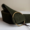 classic belt in a luxe suede fabrication and large width design with brass ring closure